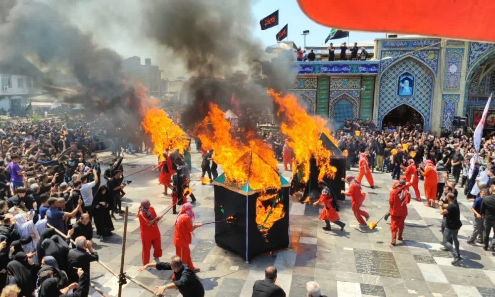 در پایان این مراسم مذهبی نیز به دستور شمر و عمرسعد نمادین لشگر یزیدیان خیمههای اهل بیت(ع) را به آتش میکشند.